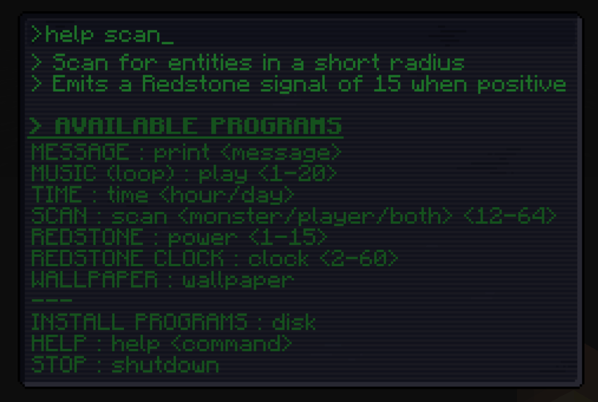 Some of the programs that can be used include the scan command, that'll allow you to return a redstone signal when a monster is detected nearby, the play command that'll play in loop any music disc track or the clock command, to be used as a compact Redstone clock !