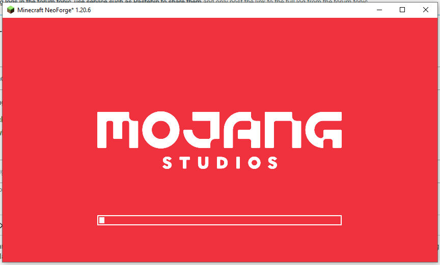 Earlier today I played an older build of my mod (requires Geckolib to run) and it worked fine. However, after re-exporting my mod today (with no changes made) it suddenly started freezing my game at the loading screen. It displays the Mojang screen with an unmoving loading bar, and whenever I enable fullscreen the application turns fully black. I've waited several minutes and the screen has not changed.